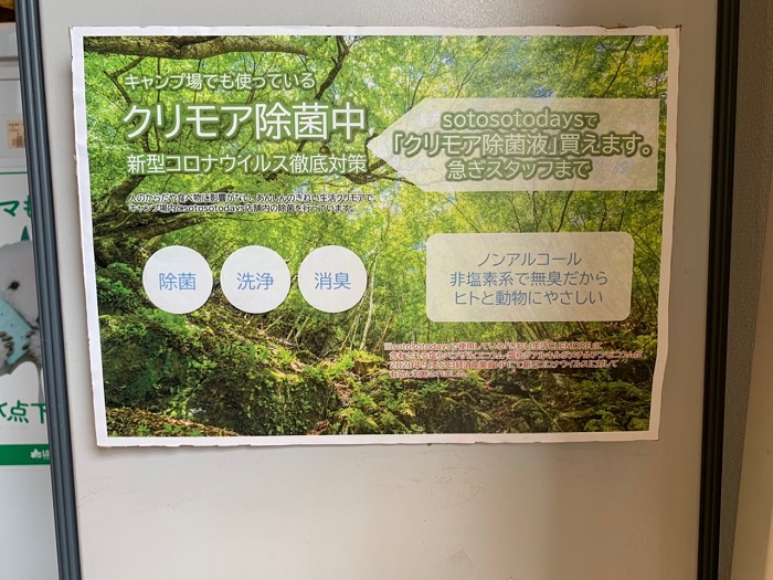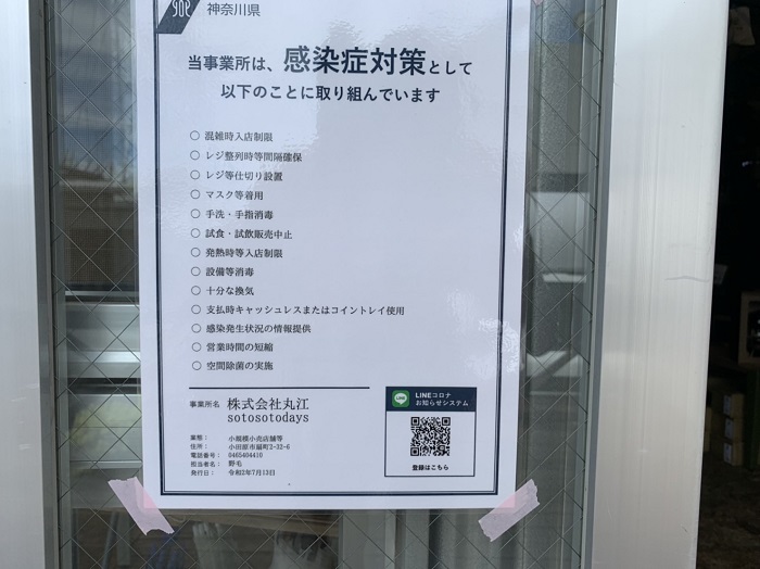 接客業なので、普段から気にしていることではありますが、特に今はスタッフの体調管理も含めて徹底して対策をしています。お店の入り口にはSotosotodaysとして取り組んでいる感染対策を掲示しています。
